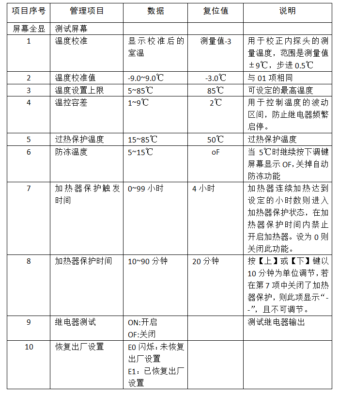 對(duì)于“雙控”機(jī)型,在開(kāi)機(jī)狀態(tài)下,同時(shí)按住【上】和【下】鍵,可查看外置探頭溫度(地溫),此時(shí)設(shè)定溫度欄顯示過(guò)熱保護(hù)溫度。松開(kāi)【上】和【下】鍵返回正常工作狀態(tài)。